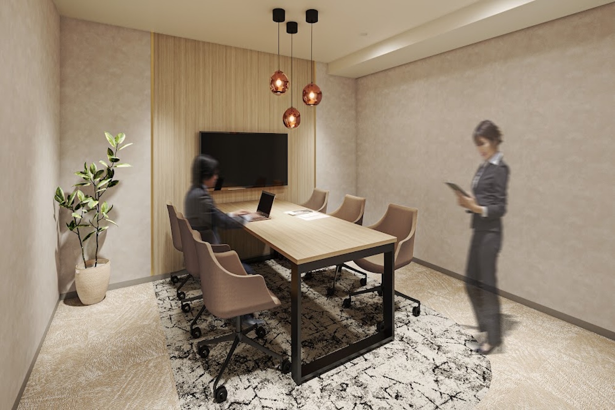 外部との商談はもちろん、社内ミーティングにも使いやすい程よいサイズ感と落ち着いた空気感が魅力です。