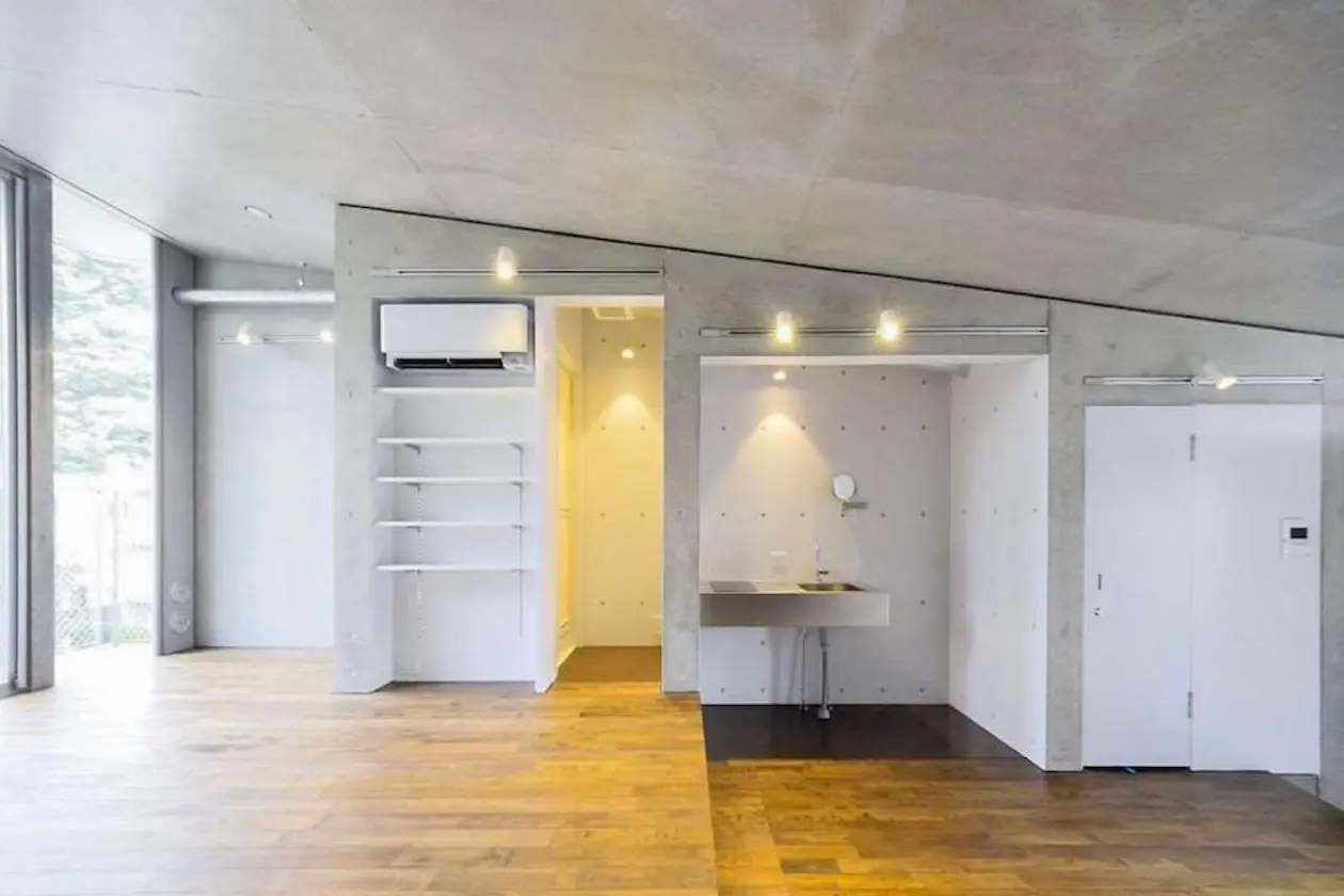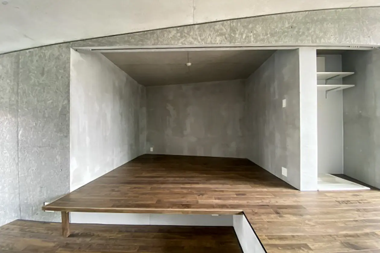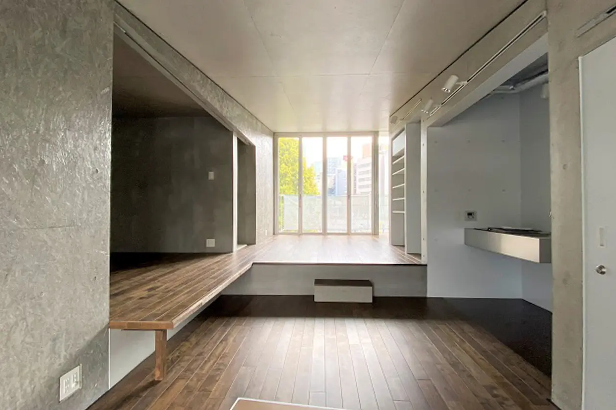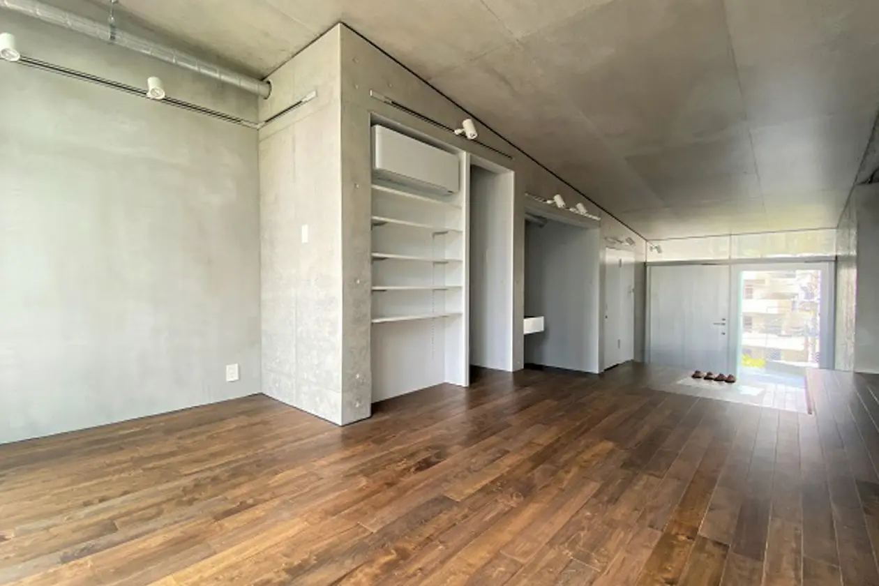 日当たりがよく、ダークブラウンのフローリング材がコンクリートの壁面と調和されています。