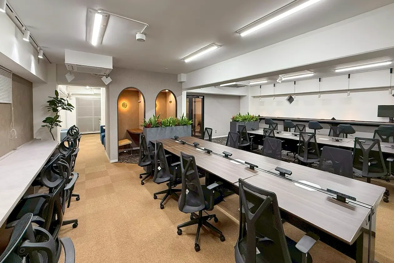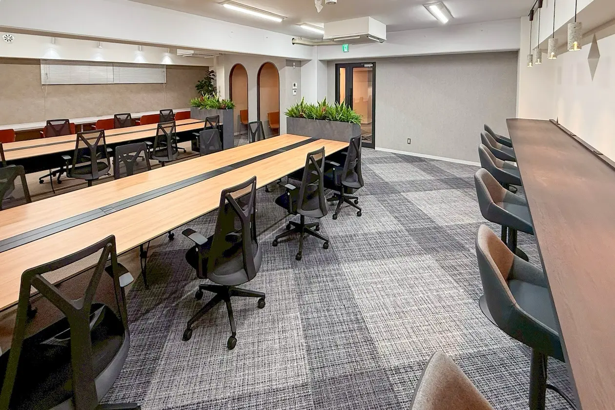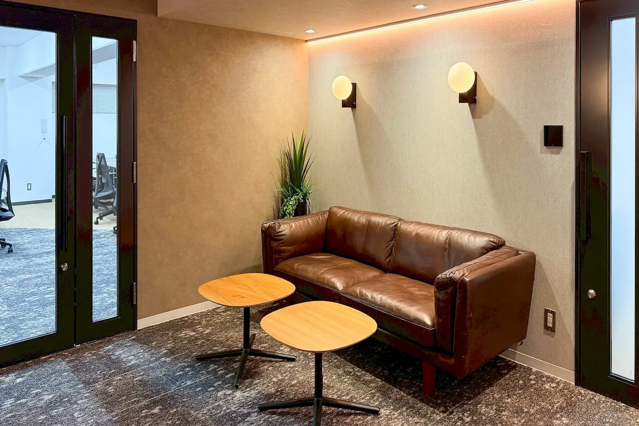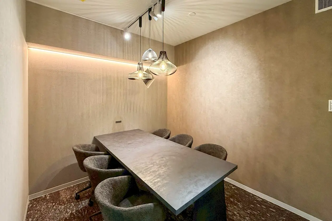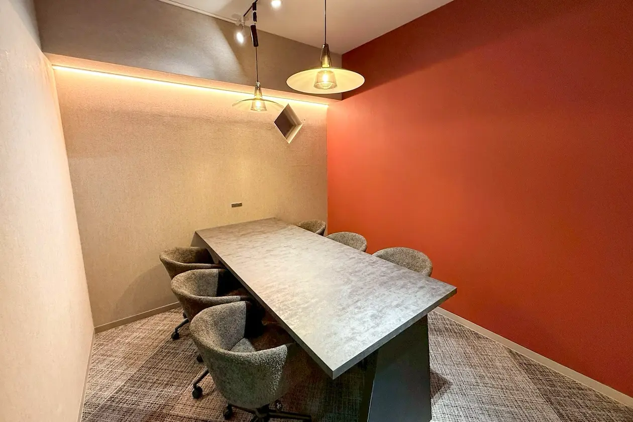 会議室も備わっており、しっかりと集中した打ち合わせやオンラインミーティングにも対応。壁面や照明には温かみのある素材と光が用いられ、長時間の使用でも疲れにくい印象です。