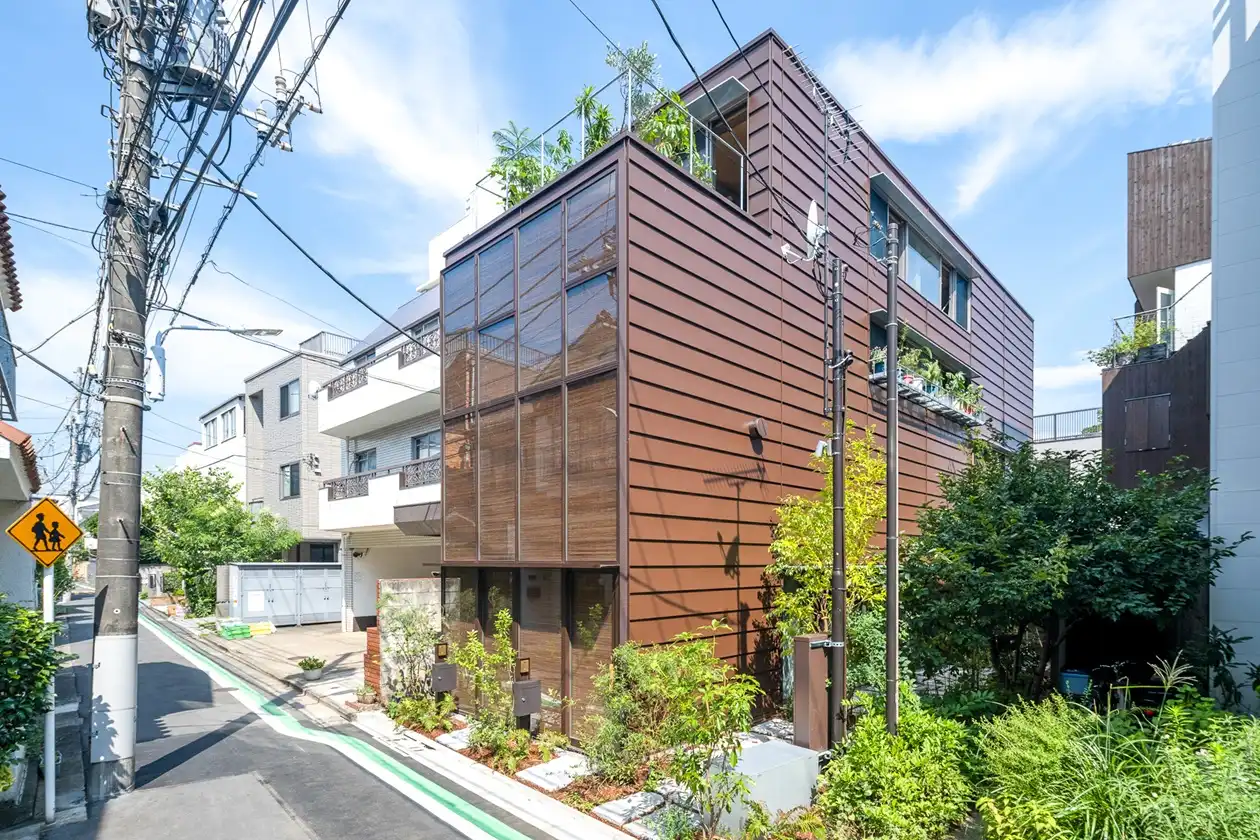 こちらが今回ご紹介させていただく立体長屋です。艶のあるブラウンの外観がひと際目を惹きます。