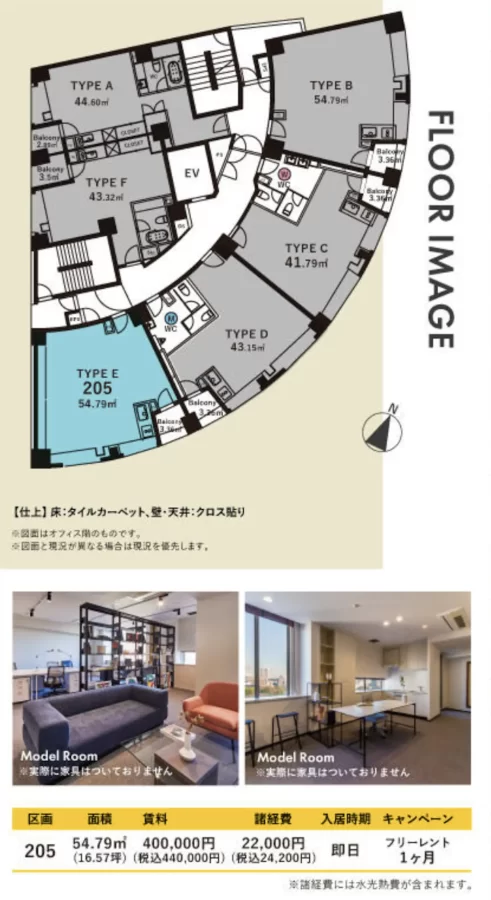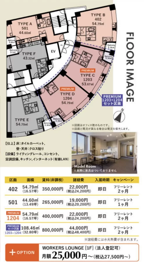 備考:定期借家契約(2年間)、期間内解約(2ヶ月前予告)、再契約料(新賃料の1.1ヶ月分)、保証会社利用必須、火災保険必須、社名表示作成料(税込¥5,500)、機械式駐車場(要空き確認、税込¥44,000/月)、WORKERS LOUNGE(法人登記可、税込¥27,500/月)、退去時原状回復費負担、更新保証料(¥50,000/年)