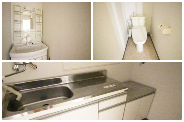 水回りは室内中央部にまとめられています。トイレ、キッチン、洗面所と事務所利用には必要な、最低限の機能性が備わっています。