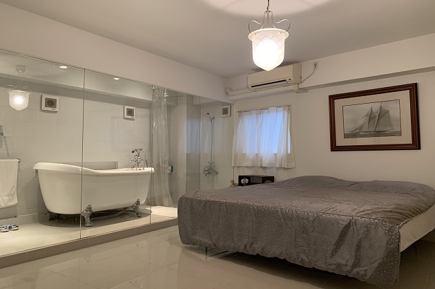 ガラス張りバスルームに猫足バスタブ、海外のホテルを思わせるおしゃれな造りですね。