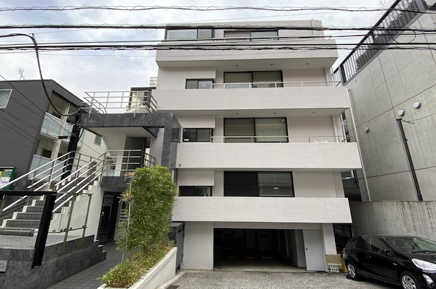 ホワイトのタイルが特徴的なファサード。エントランスは向かって左側です。