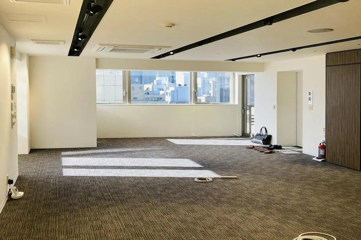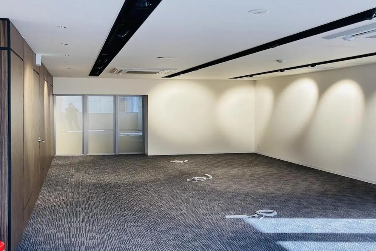 室内はフロアカーペットに白壁白天井、黒のライティングレールが設置されています。