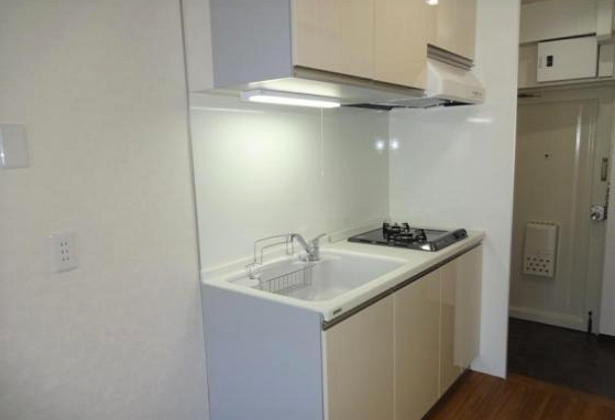白のシステムキッチンは最低限の設備が備えられ、事務所利用にはちょうどいいサイズ感。