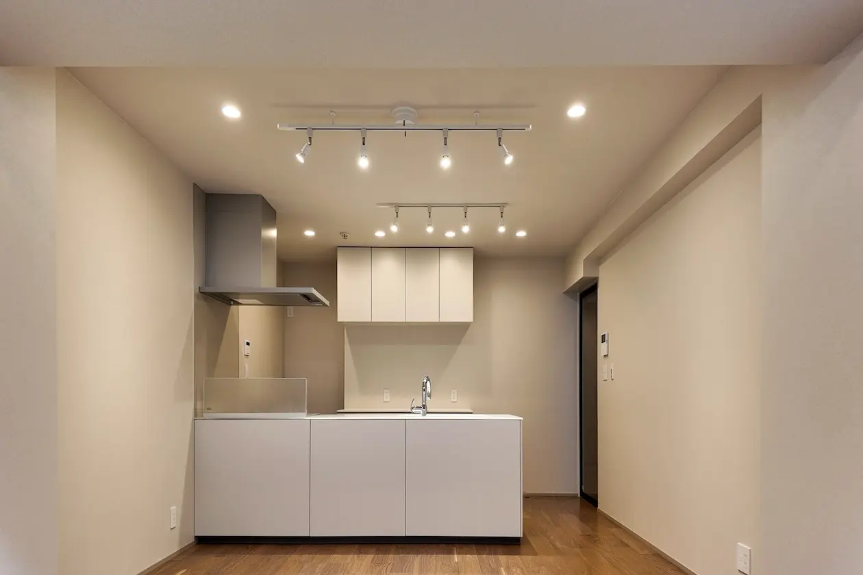 スポットライトが空間にリズムを生み、ワークスペースとしても洗練された雰囲気を演出します。