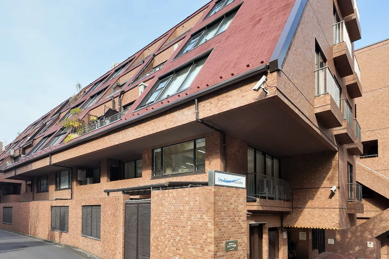 傾斜屋根と規則的に並ぶ窓が印象的で、都心でありながらどこかゆとりを感じさせる佇まいです。1978年築の建物ですが、丁寧に管理されてきた雰囲気が伝わり、来客時にも安心感を与える外観です。