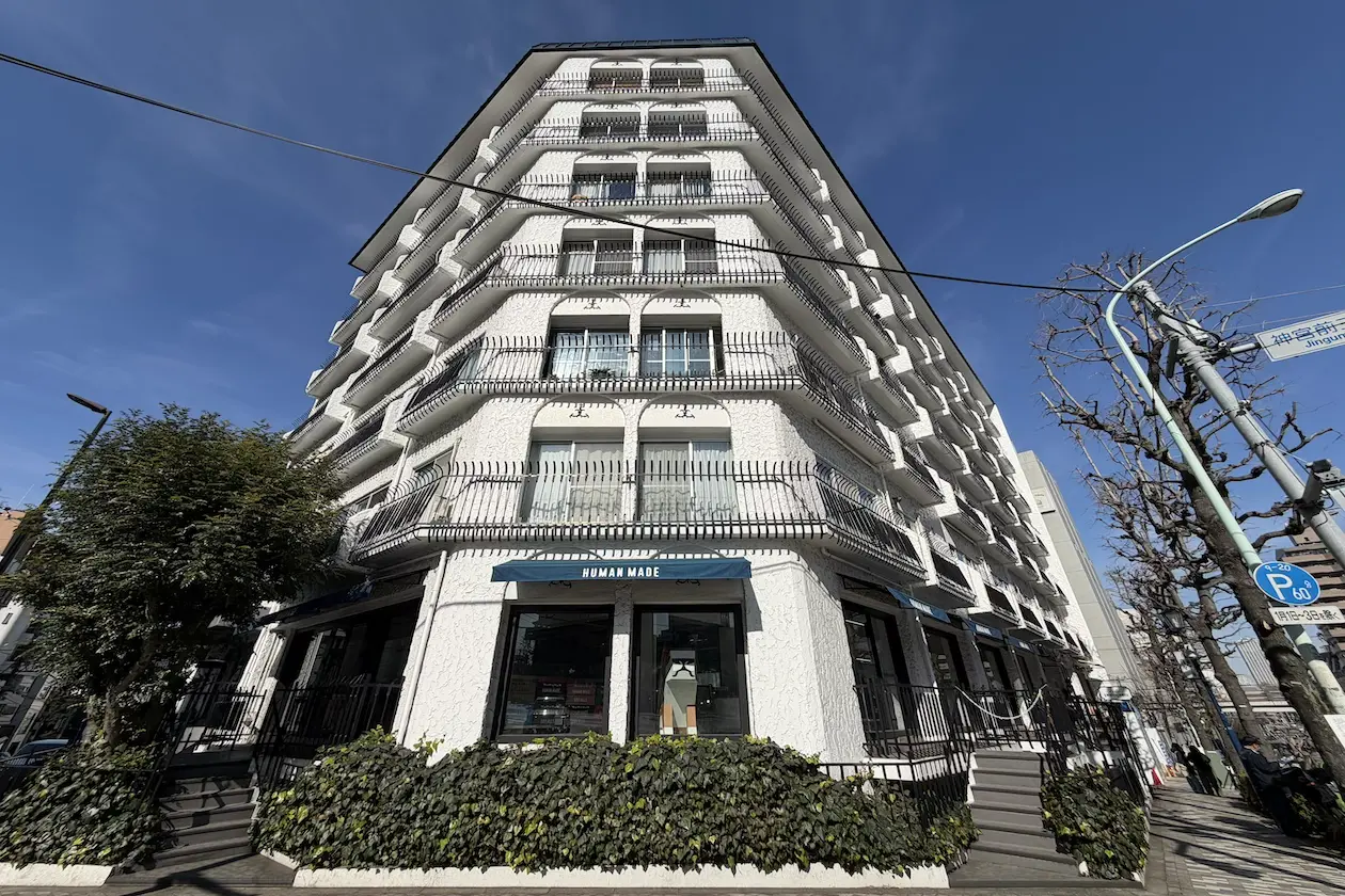1階にはHUMAN MADEが入居し、和モダンでランドマーク的な存在感を放っている。
