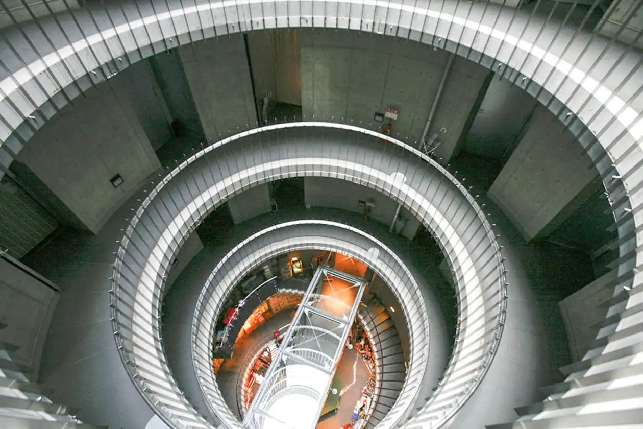 建物の中央をらせん状に抜ける外廊下のデザインは圧巻となっています。