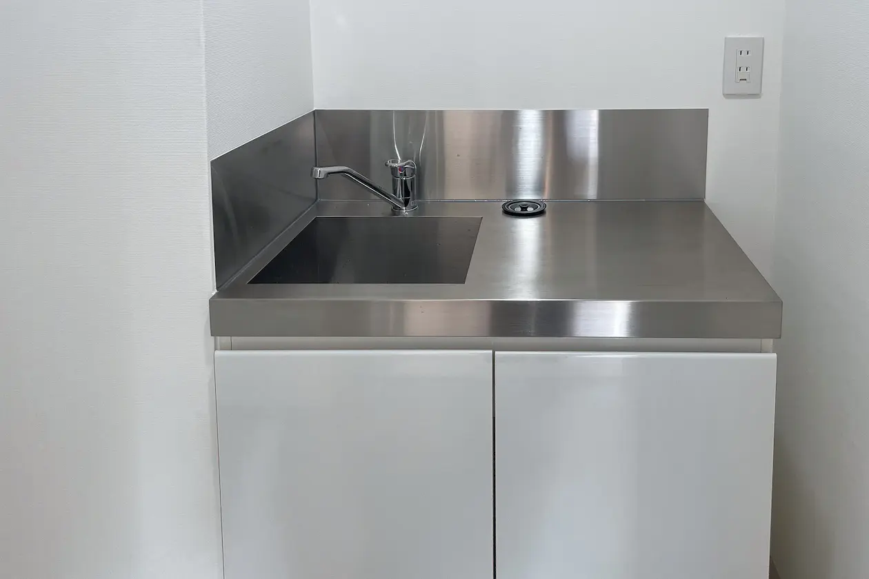 天板・シンク・立ち上がりまでステンレスで統一されており、清潔感がありつつ、業務用らしい実用性を重視した仕様になっています。