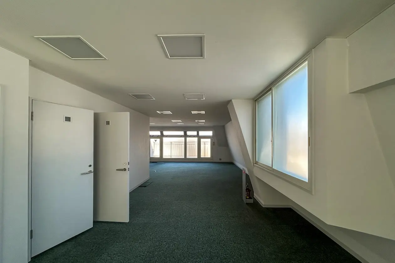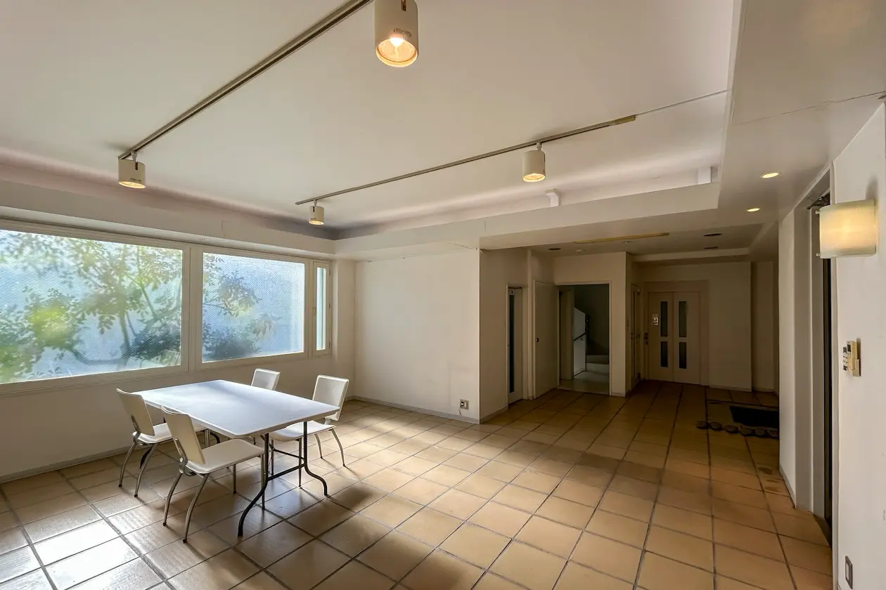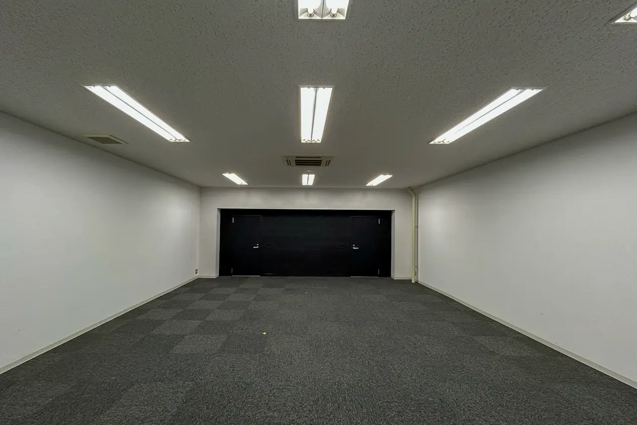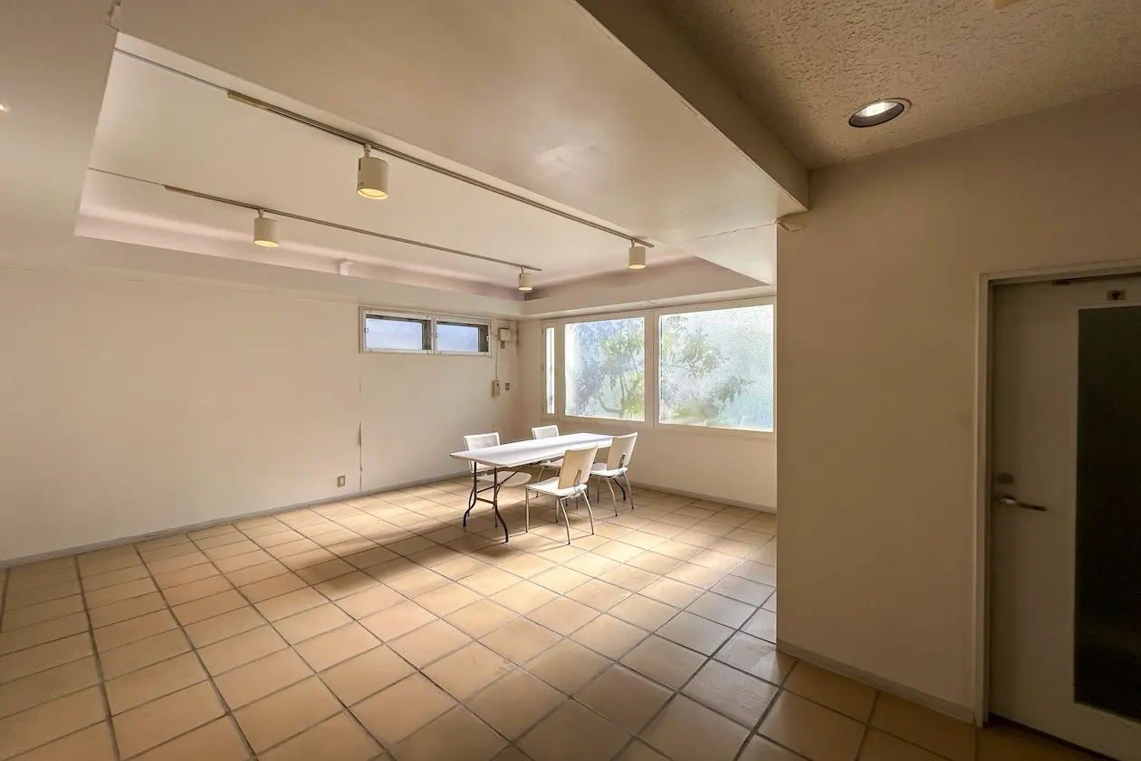 床はタイル仕上げで、ミーティングテーブルを置いた打ち合わせスペースとしてはもちろん、ショールームや応接を兼ねたワークスペースとしてもイメージしやすい印象です。天井にはライティングレールが設置されており、用途に応じて照明計画を柔軟に調整できる点も特徴的です。