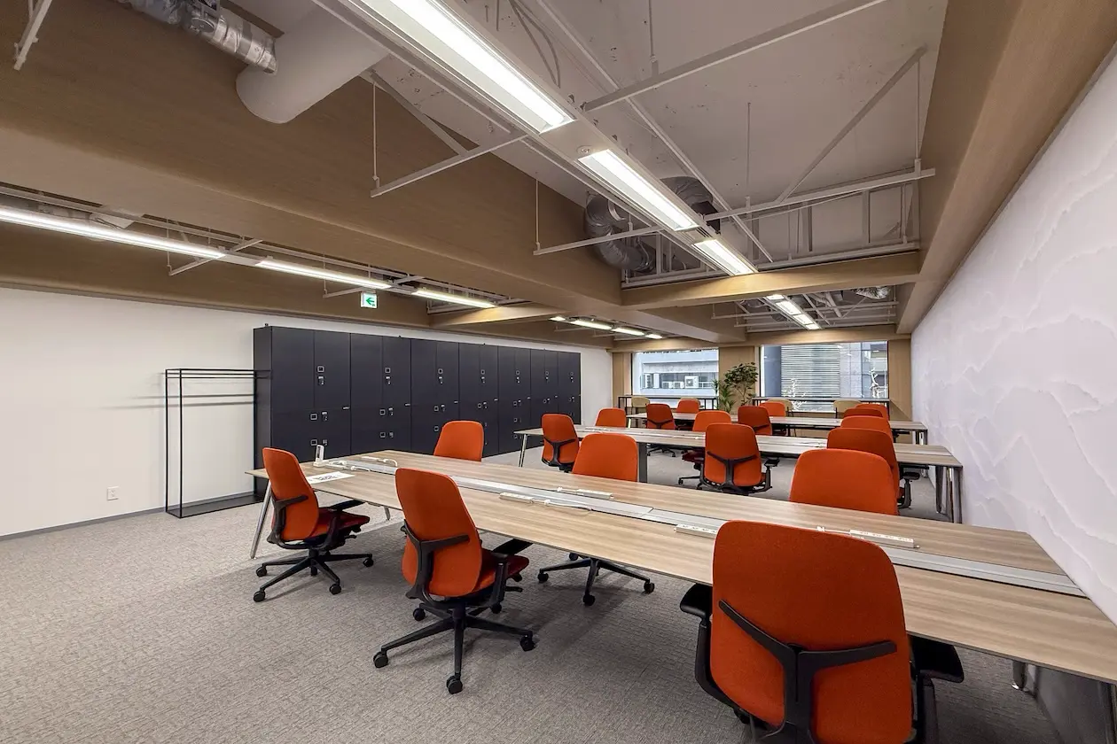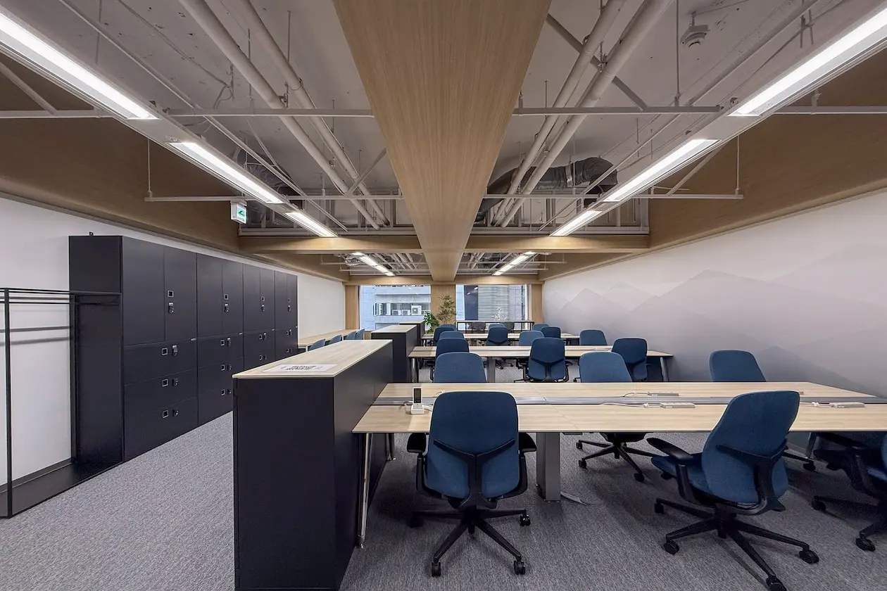 竹橋駅徒歩3分、木目と無機質が調和するセットアップ空間。共用ラウンジも活用できる、広がりのある働き方を。