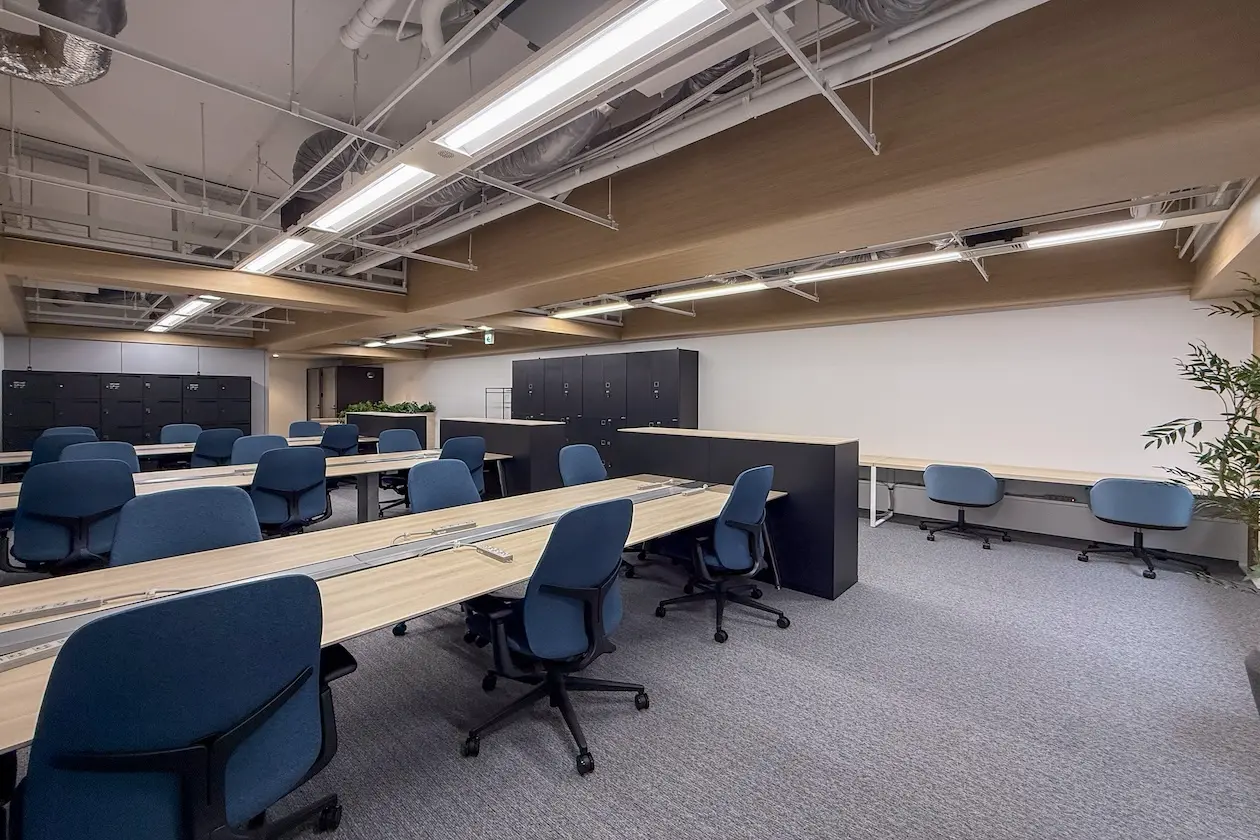 中央にデスクをまとめた島型レイアウトにより、チーム内のコミュニケーションも取りやすく、プロジェクト単位での業務にもフィットします。