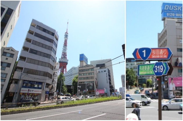 神谷町駅を降りると、東京タワーが裏から見える桜田通り。まっすぐ歩きます。