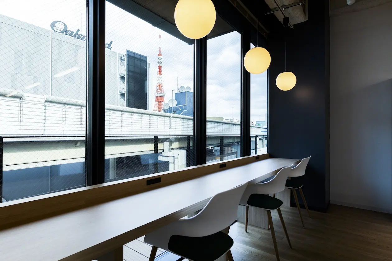 こちらは5階フロア、モノトーン調の家具で統一されたスタイリッシュな印象。固定席は20名前後で使用可能です。