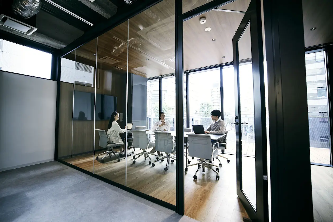 会議室は、光を通す全面ガラス張り仕様。8名前後で使用可能です。