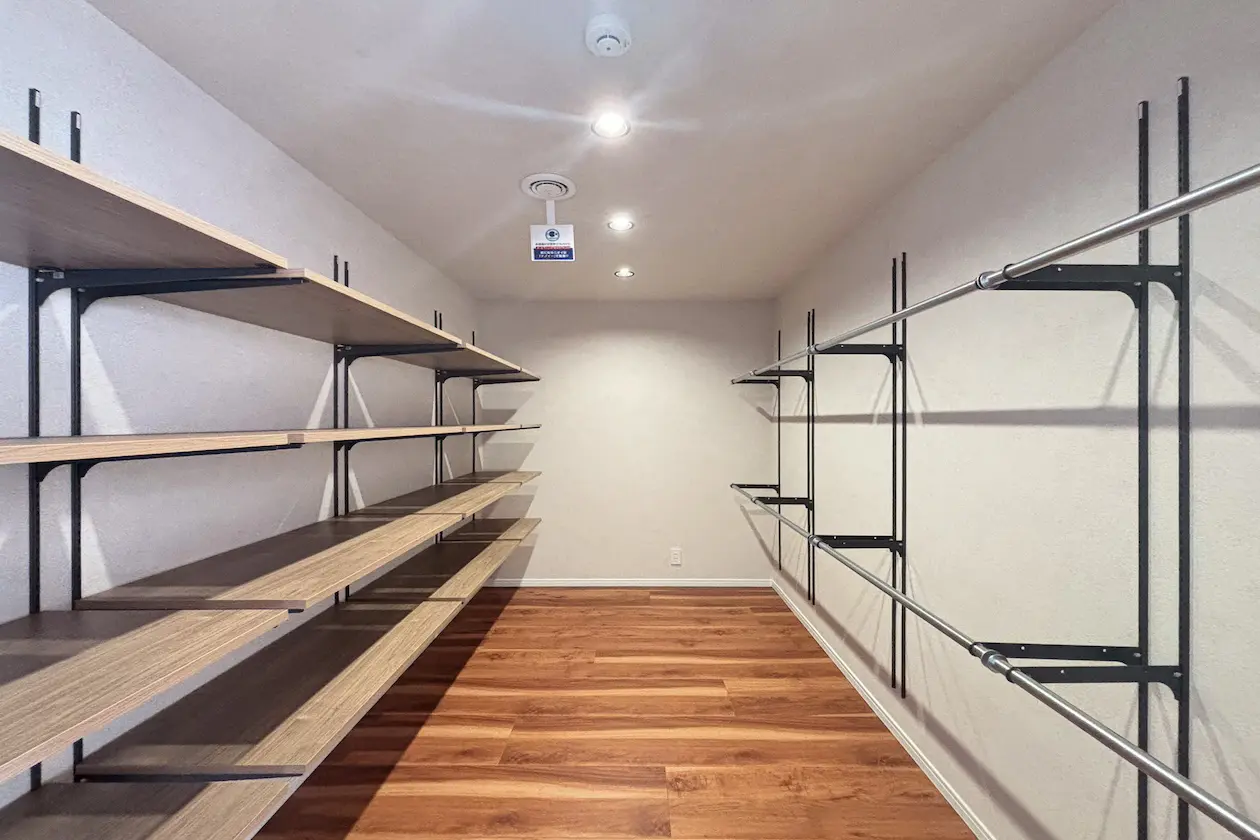 壁面を活かした造作棚とハンガーパイプが印象的な、多目的に使えるストレージスペース。