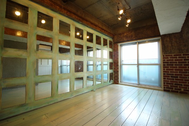 ミラーが均等に施された珍しい壁面は、少し空間を広く感じさせます。