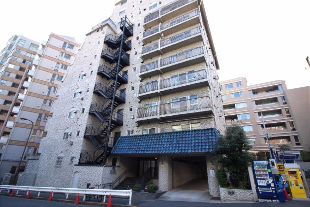 麻布通に面した本物件。外観は特徴のある壁面と青の瓦が印象的なビンテージマンション。