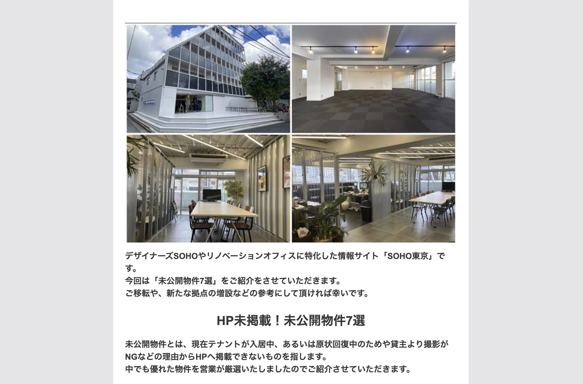 もし、「自分たちに最適な一軒」をより確実に見つけ出したいなら、ぜひ私たちSOHO東京へお声がけください。表には出ない未公開情報や、クリエイティブな視点での物件提案で、拠点探しをパーソナルにサポートします。また、最新の注目物件をいち早くキャッチしたい方は、メルマガへの登録も忘れずに。