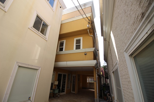黄色の外壁が印象的な外観。1階は他テナントが入居中ですがガレージは無料で利用可能。路面の手前まで縦並びで3台停められます。