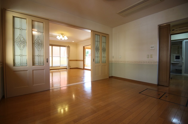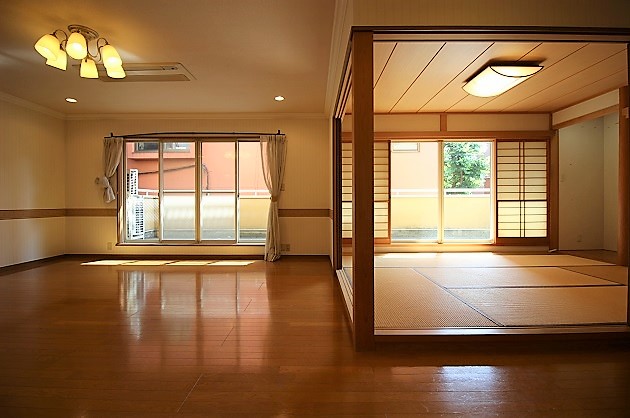 エントランスを入って階段を上った先の16帖のメインルーム。6帖の和室付きですが構造壁でなければ予算内で撤去することも可能です。