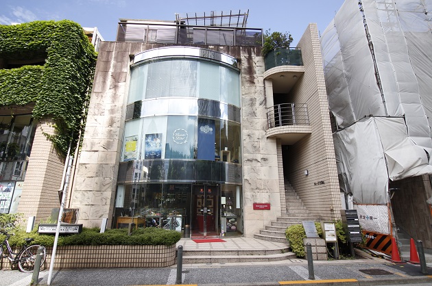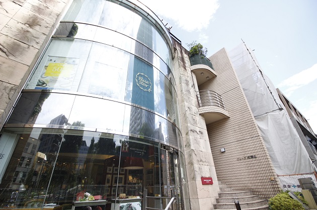 今回ご紹介するのはこちらの物件の3階部分。アールが描かれたガラス窓が印象的な外観です。このガラス窓部分には道行く人々へのディスプレーが施されており、効果的なアピールが可能。また1階部分はマカロンやショコラが並ぶスイーツのお店が入っており、ひときわ目を惹く建物です。