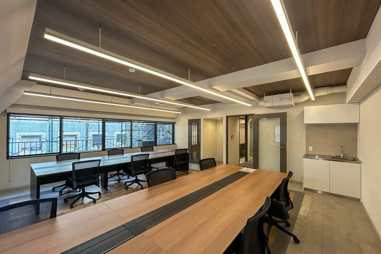 室内はワンフロアで一体感のあるレイアウトとなっており、大型のワークテーブルを中心にチームでの業務が行いやすい構成。複数名が同時に作業できる余裕のある広さが確保されているため、部署単位での利用やプロジェクト型のチーム運用にも適しています。