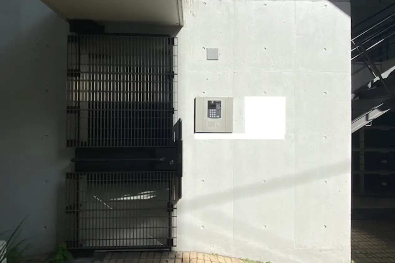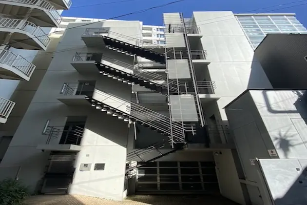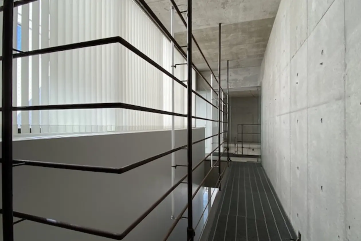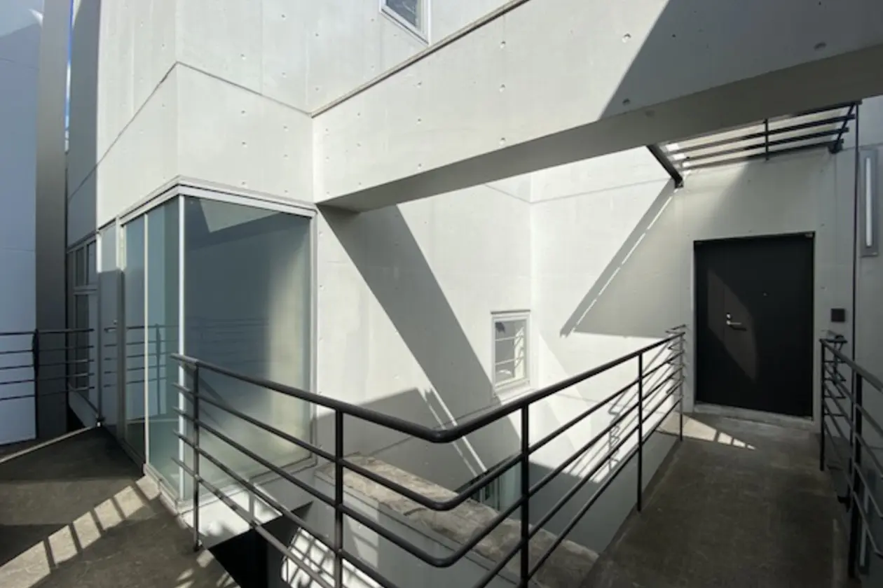 駒沢通りから少し入ったところに佇むこちらの物件。コンクリート打ち放しの外観に、中央の大きな階段が印象的です。