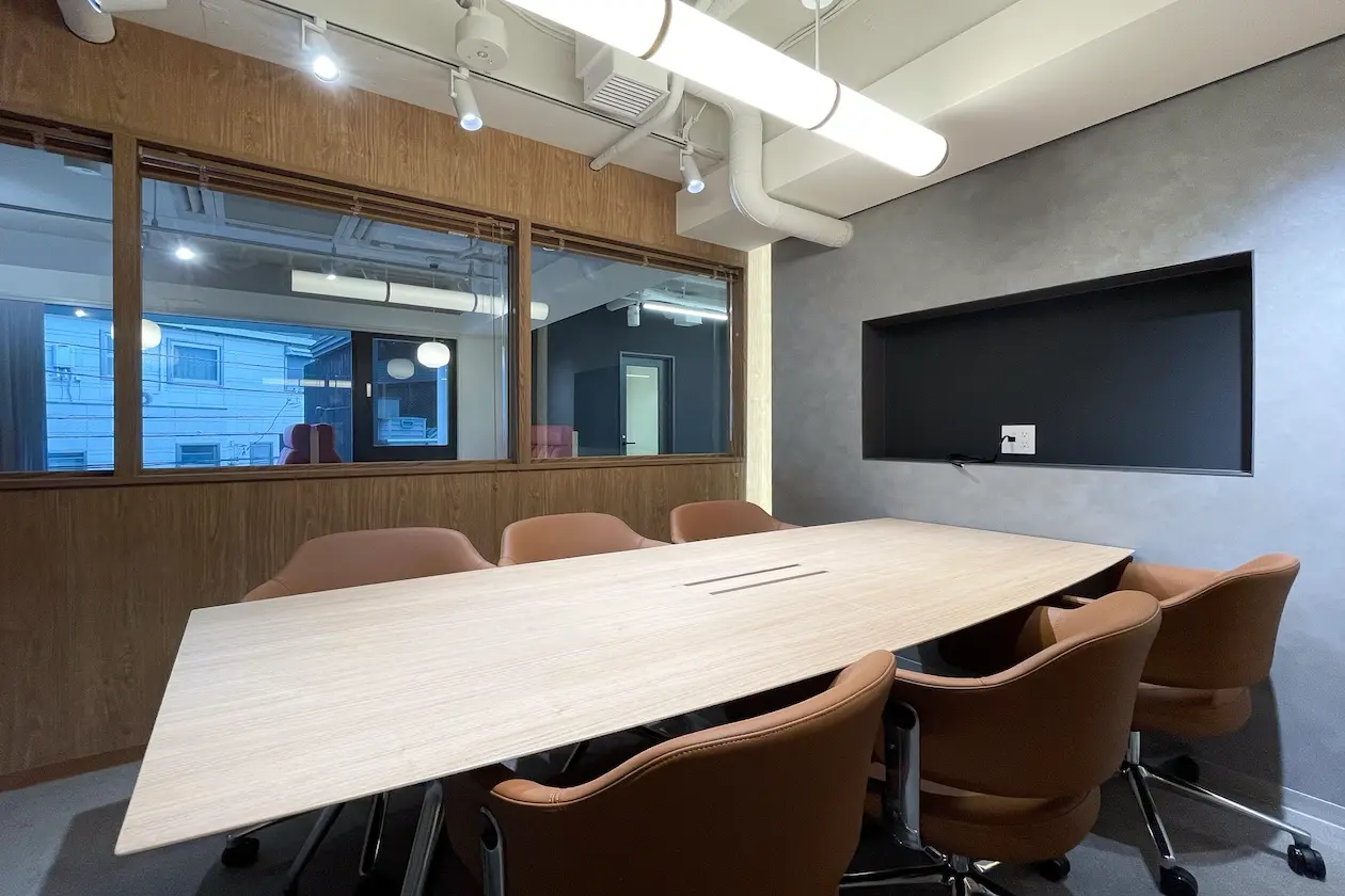 ナチュラルな木目とグレージュの壁面が、冷たくなりがちな会議室に心地よい温もりを添えています。