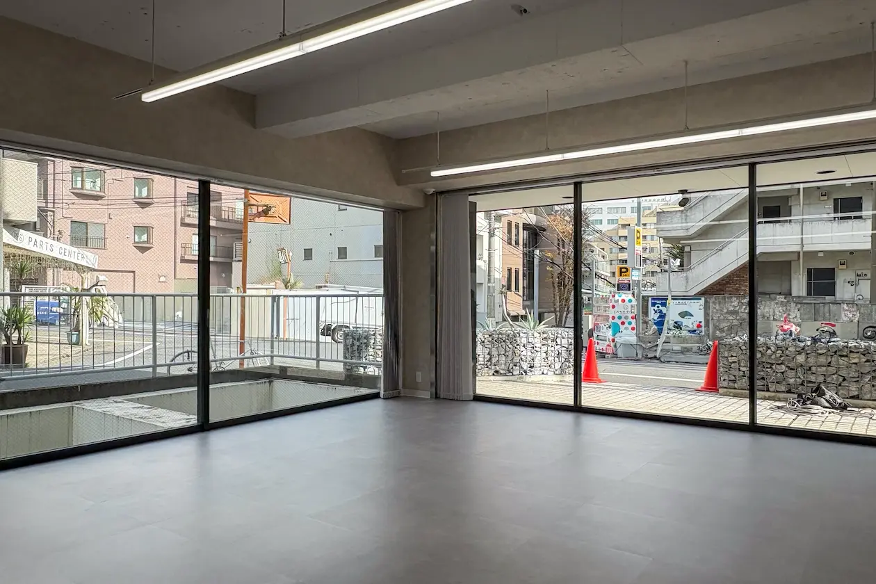 外観は大きなガラス窓とシンプルなレンガ調の外壁が調和し、都市的でありながらも落ち着きのある印象を与えています。