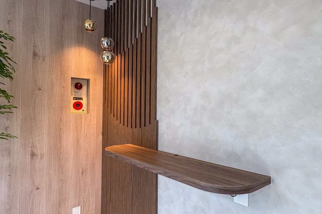 植栽やアイアンウッドの家具を配置し、空間に温かみと緑を持たせると良さそうです。