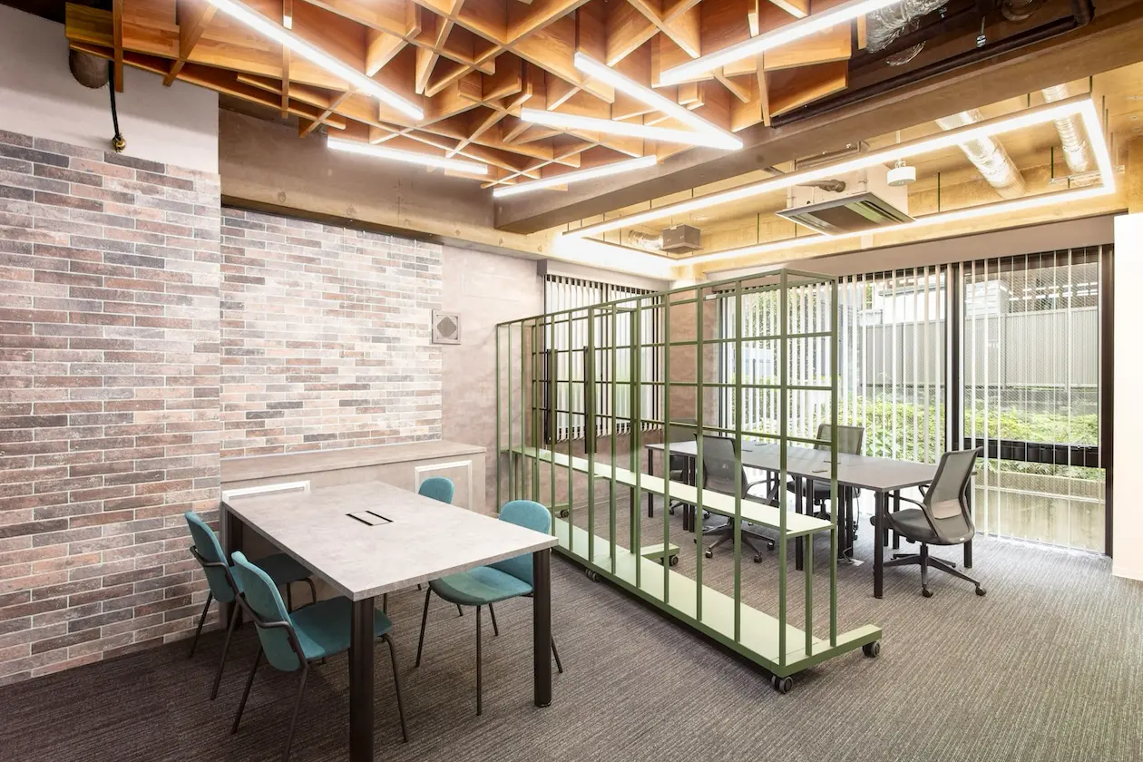 無機質になりがちなオフィスに、素材感のあるレンガ壁とグリーンのパーティションが落ち着きを添え、程よくクリエイティブなムードをつくり出しています。