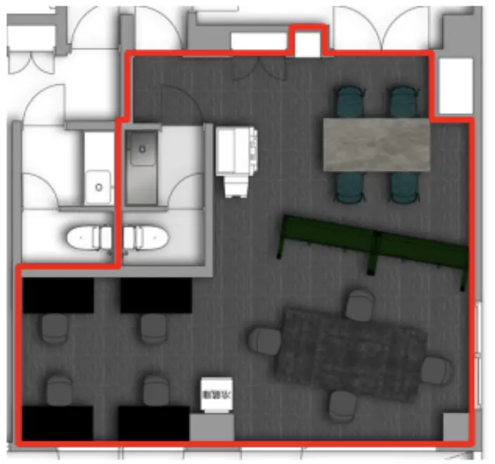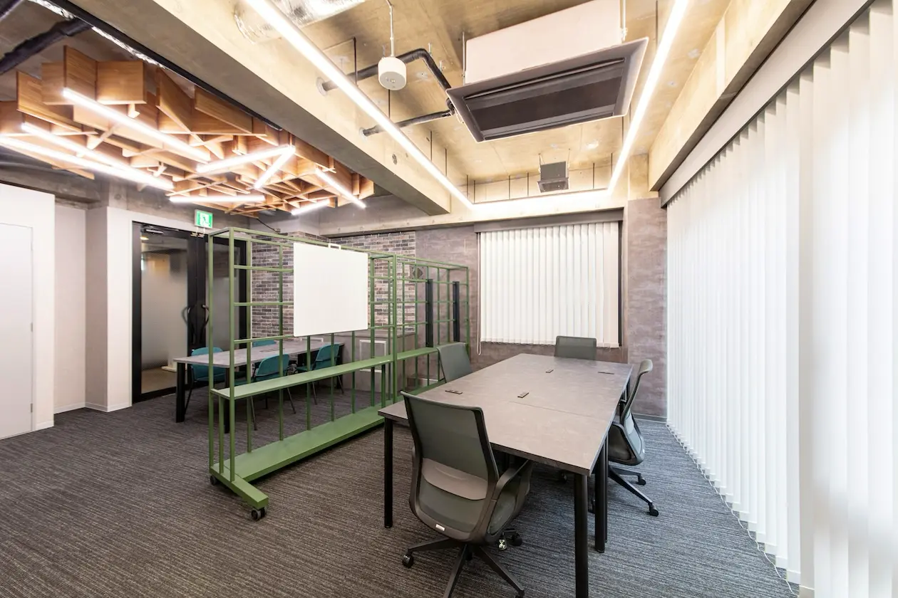 ワークテーブルはゆったりめのサイズ感で、4〜6名の作業にも十分。視線が抜ける配置のため、区切られた空間でも閉塞感がなく、チームでの集中作業からカジュアルな打ち合わせまで幅広く対応できます。