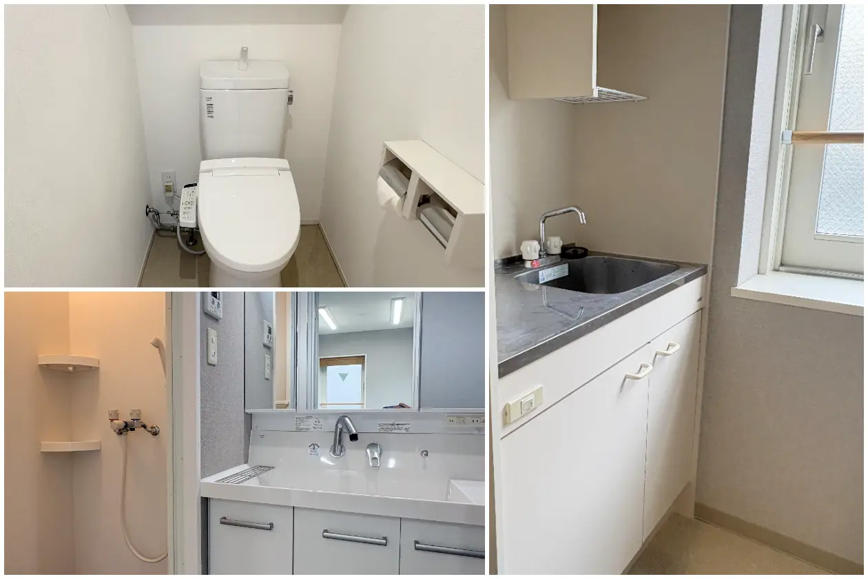 トイレ・洗面台・ミニキッチンを備えた水回りは、清潔感のあるシンプルな仕様。お手洗いは1階と3階に設けられており、複数フロア利用時にも動線を確保しやすい構成です。