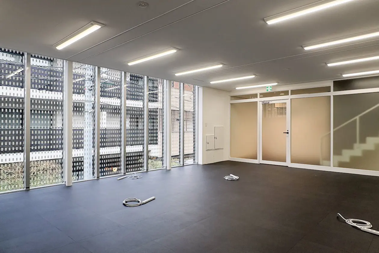 2階の室内は、落ち着いたトーンでまとめられたシンプルかつ洗練された空間です。壁一面の大きな窓からは明るい自然光がたっぷりと差し込み、開放感あふれるワークスぺースを演出します。