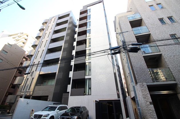 ダークトーンのスタイリッシュな外観。周辺には数多くの飲食店やコンビニがあるので食事に困ることはなさそうです。また本物件から徒歩2分程度のところにバス停があるので、渋谷や麻布方面へのバスでのアクセスも抜群。