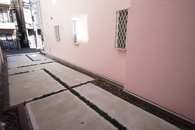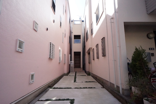 両サイドの物件に挟まれ、エントランスのみ見えている物件が今回ご紹介する戸建物件。