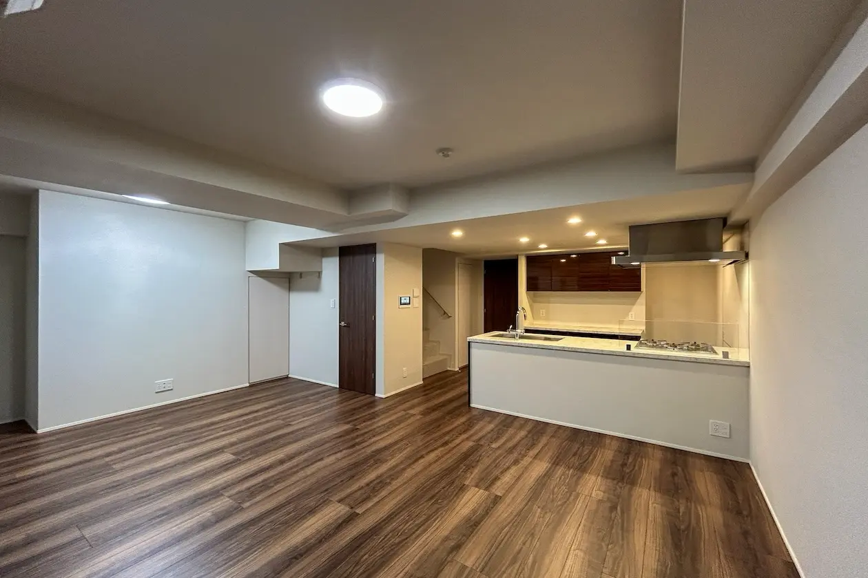 室内は20帖を超える広々としたリビングダイニングを中心に構成。1階・地下1階のメゾネットタイプで、上下階を用途に応じて使い分けることができます。