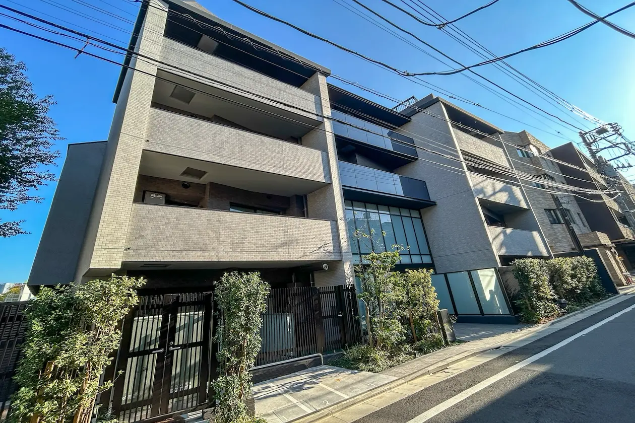ファサードはグレージュトーンのタイルを基調とし、分譲マンションらしい重厚感と洗練を感じさせます。