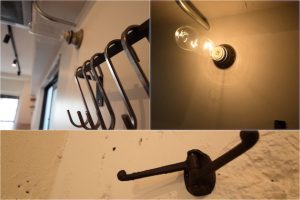キッチン周りのフック、玄関のコート掛け、素材感が統一されて部屋の雰囲気に溶け込んでいます。