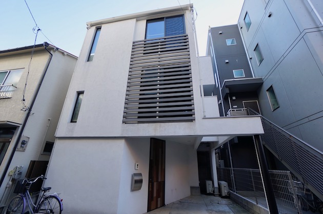 2014年築の浅築物件。白を基調としたファサードで、ウッドのドアが可愛らしい外観です。