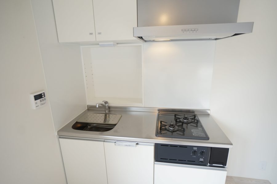 キッチンはコンロ式。新築の真新しいキッチンで自慢の手料理を振る舞ってみては。