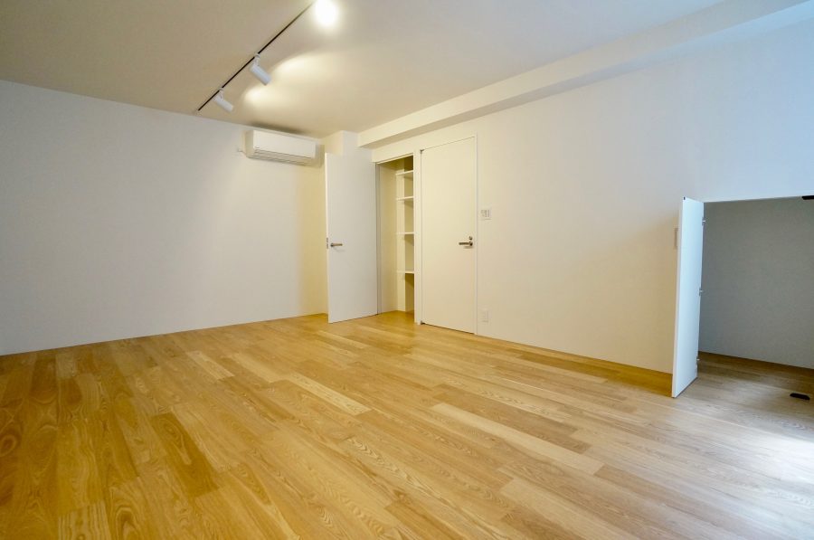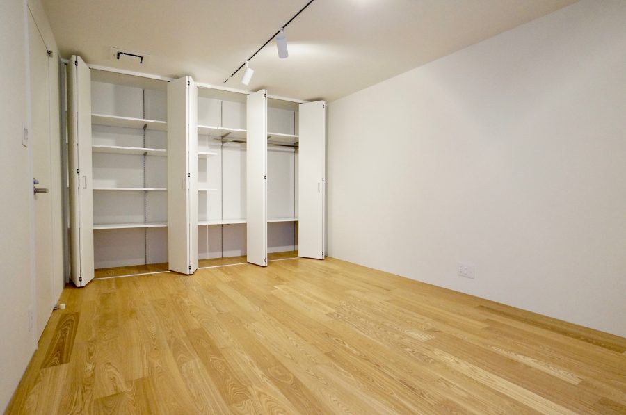 地下には広めのお部屋が2つ。こちらは12帖のお部屋。階段下のスペースは収納になっていて、無駄がありません。