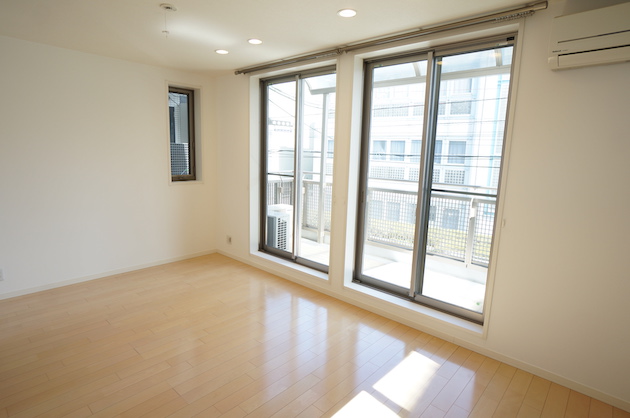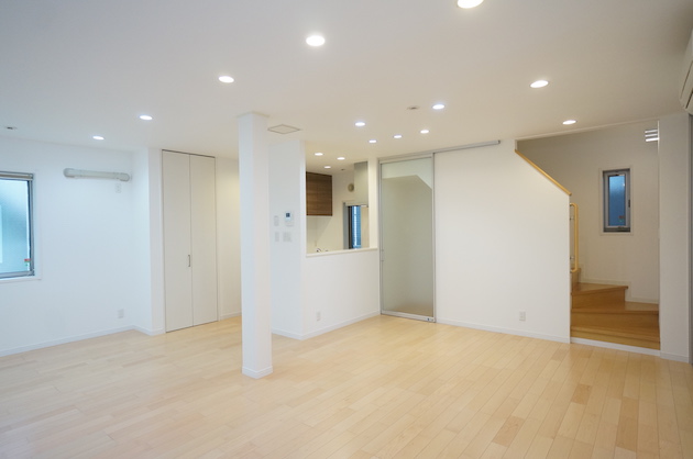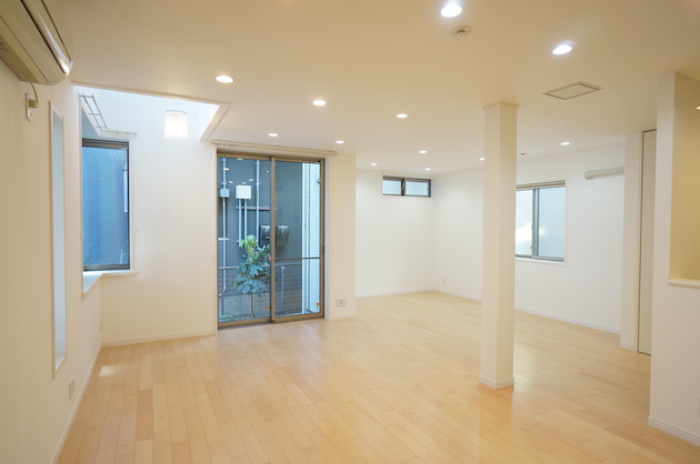 今回は、そんな不動前駅から徒歩2分の駅近戸建SOHOをご紹介します。こちらが1階リビング。2019年3月にリノベーション済みの室内は、白壁と薄色のフローリングのクリーンなイメージの内装です。各方角に窓が多いのも戸建ならではの嬉しいポイントですね。