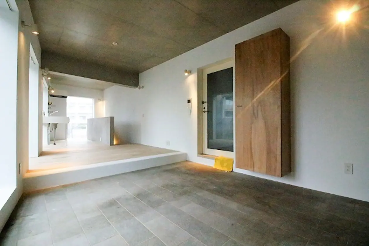 2階玄関から入ると、タイルのようなフロアが広がり、奥の小上がり部分は木目調のフローリング仕様で温かみのある空間となっています。