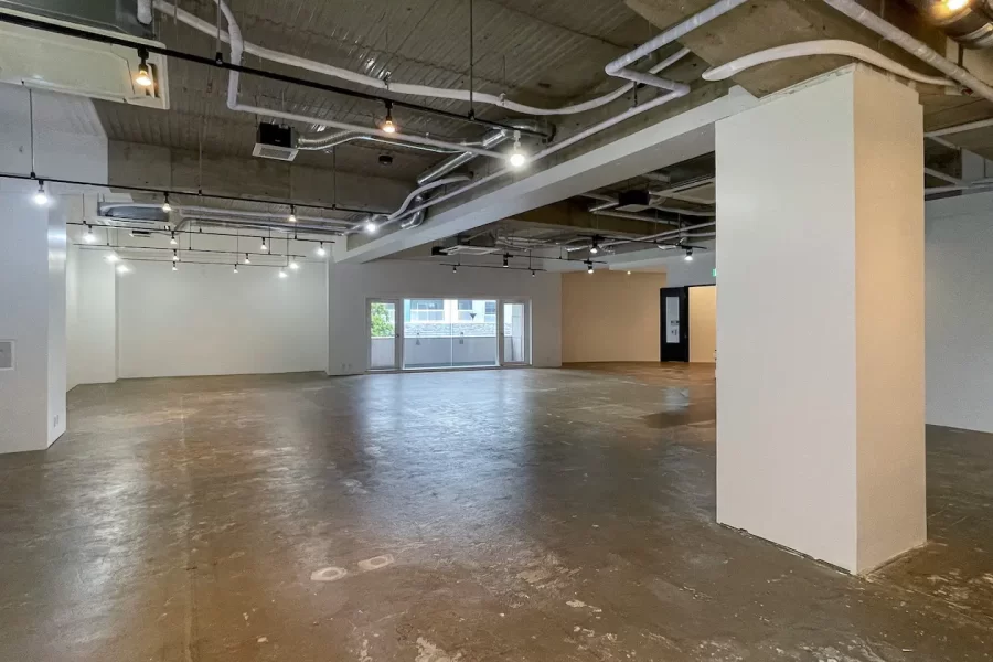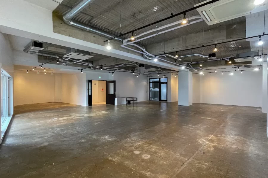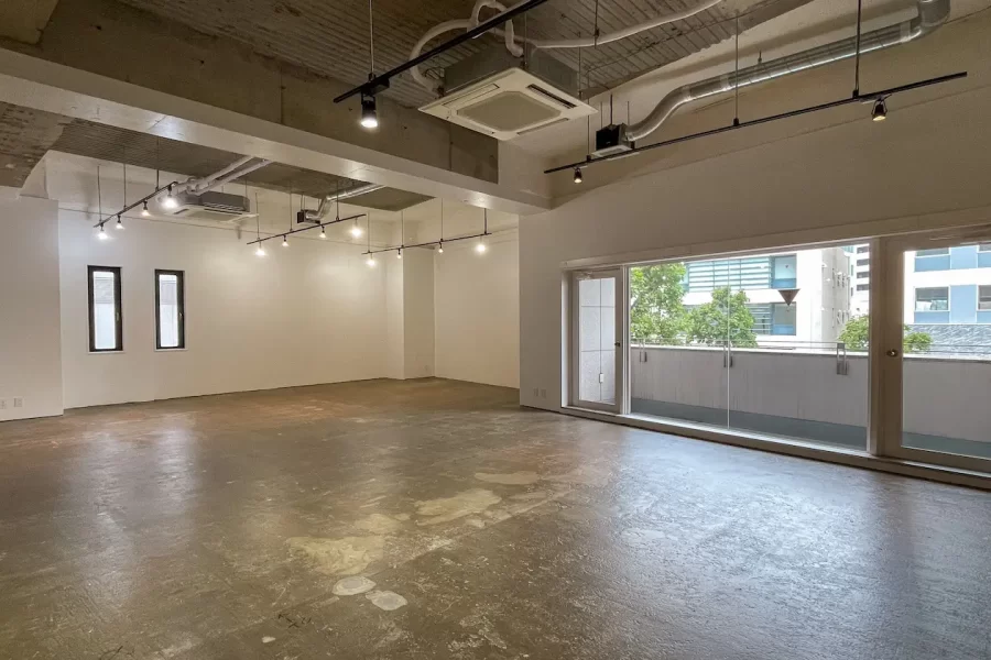 床はコンクリート仕上げで壁は白塗装かつ、天井高が2.8mの広々とした空間となっています。