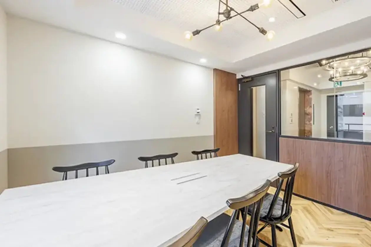 来客を交えた内合わせや社内ミーティングなど幅広いシーンで使いやすい一室です。