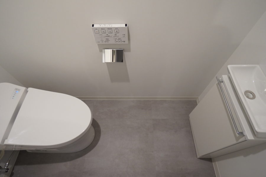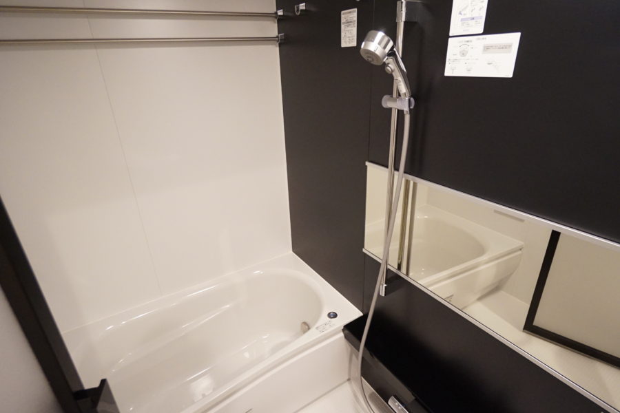 追い炊き、ウォシュレット完備の水周りはお部屋とは対照的にモノトーンで統一されています。